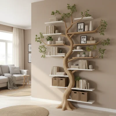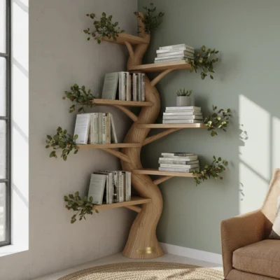 One of the best spots for a tree bookcase is the living room, especially in unused corners that often go to waste. Its vertical design fills the space without making the room feel crowded, making it a smart solution for small layouts.