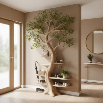 Tree bookcases also work surprisingly well in entryways, where space is limited but organization is key. Use it to store shoes, bags, umbrellas, keys, or even a small plant to greet guests with a warm, personal touch.